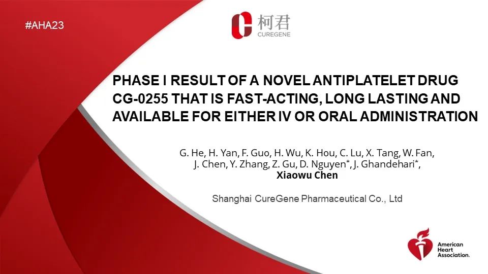 At the recently concluded 2023 American Heart Association (AHA) Scientific Sessions 2023, Dr. Chen, Vice President of Chemistry at CureGene, was honored with an invitation to deliver a special presentation entitled "Phase I Result of a Novel Antiplatelet Drug CG-0255 That is Fast-Acting, Long Lasting and Available for Either IV or Oral Administration" on November 12, 2023. As a Featured Science speaker at this prestigious event in the cardiovascular domain, Dr. Chen shared insights from Phase I trials of CG-0255 administered intravenously.